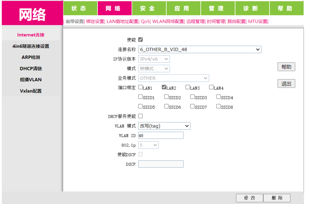 5、 去到光猫的网络连接这里,可以看到已经有了5个连接在那里,最后的internet(VLAN41)是上网连接,默认绑定了LAN1、3,倒数第二个是IPTV(VLAN48),默认绑定了LAN2,倒数第三个也是IPTV(VLAN50),默认绑定了LAN4。