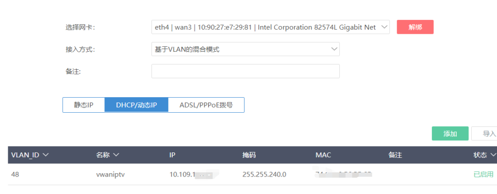 2、 先在DHCP/动态IP里创建个IPTV的线路。点击添加,VLAN_ID填刚才光猫看到的IPTV的VLAN值(我的是48),名称起个vwaniptv吧,MAC地址填盒子的MAC,然后确认,正常的话会自动获取到之前的盒子IP了。
