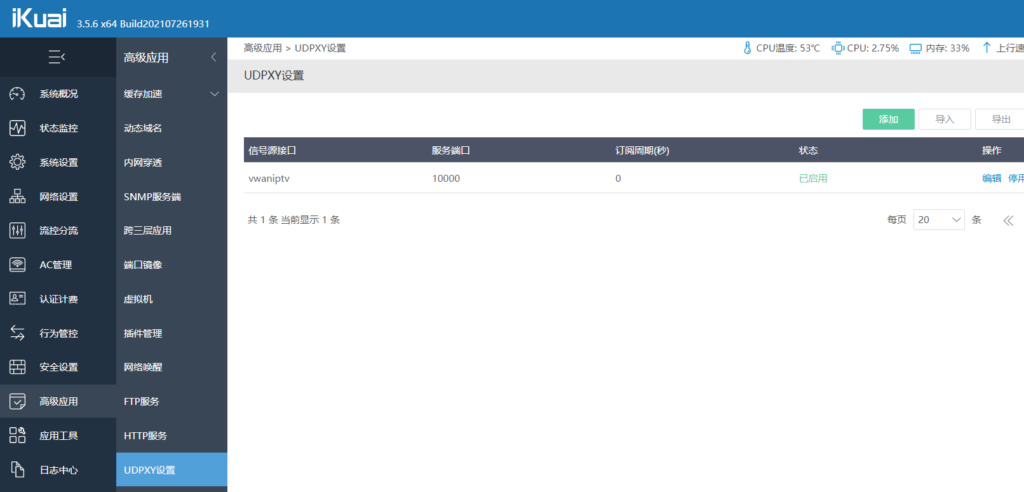 2、 在“高级应用 > UDPXY设置”里,添加,信号源接口选择IPTV的线程vwaniptv,服务端口随便填个5位数的,我填吧10000。