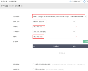 2、网卡选择vnet,接入方式是静态IP,IP填写192.168.100.2,网关填192.168.100.1,然后保存(这个是istoreos的默认lan地址,如果你填别的,后面就要修改istoreos的lan ip)。