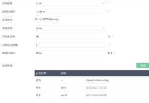 3、 在高级应用、虚拟机里添加一下虚拟机,名称随便写(比如istoreos),CPU使用率给个90%,核心数量1,内存1024就可以了,然后在设备管理里添加磁盘,磁盘类型选择引用磁盘,磁盘路径选择刚才上传的istoreos.img路径(文件管理那里可以复制路径),然后保存。然后再添加一个网卡,桥接接口选择wan2,然后保存。